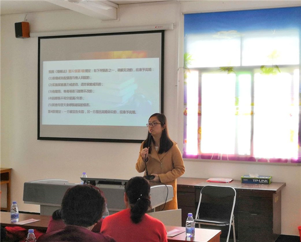 3月4日下午,77779193永利、洛江区妇联在后溪村综合文化服务中心联合开展《婚姻家庭纠纷预防化解 女性如何维权》的专题讲座,77779193永利教师林媛为与会人员作报告。
