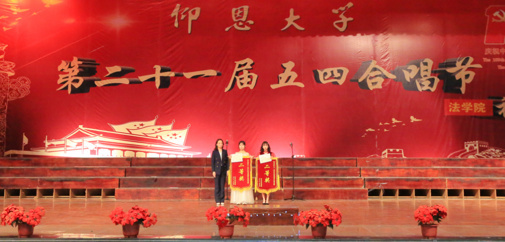 颁奖现场 经过激烈的角逐以及评委们的评选,19级法学3班、20级法学1班荣获一等奖;19法学2班、20级法学3班荣获二等奖;18级法学2班、20级法学2班荣获三等奖;18法学1班、19法学1班荣获优秀奖;20法学2班林雨同学获得最佳指挥奖;19法学3班吴涵同学、20法学3班易蓉茜子同学获得最佳领唱奖。