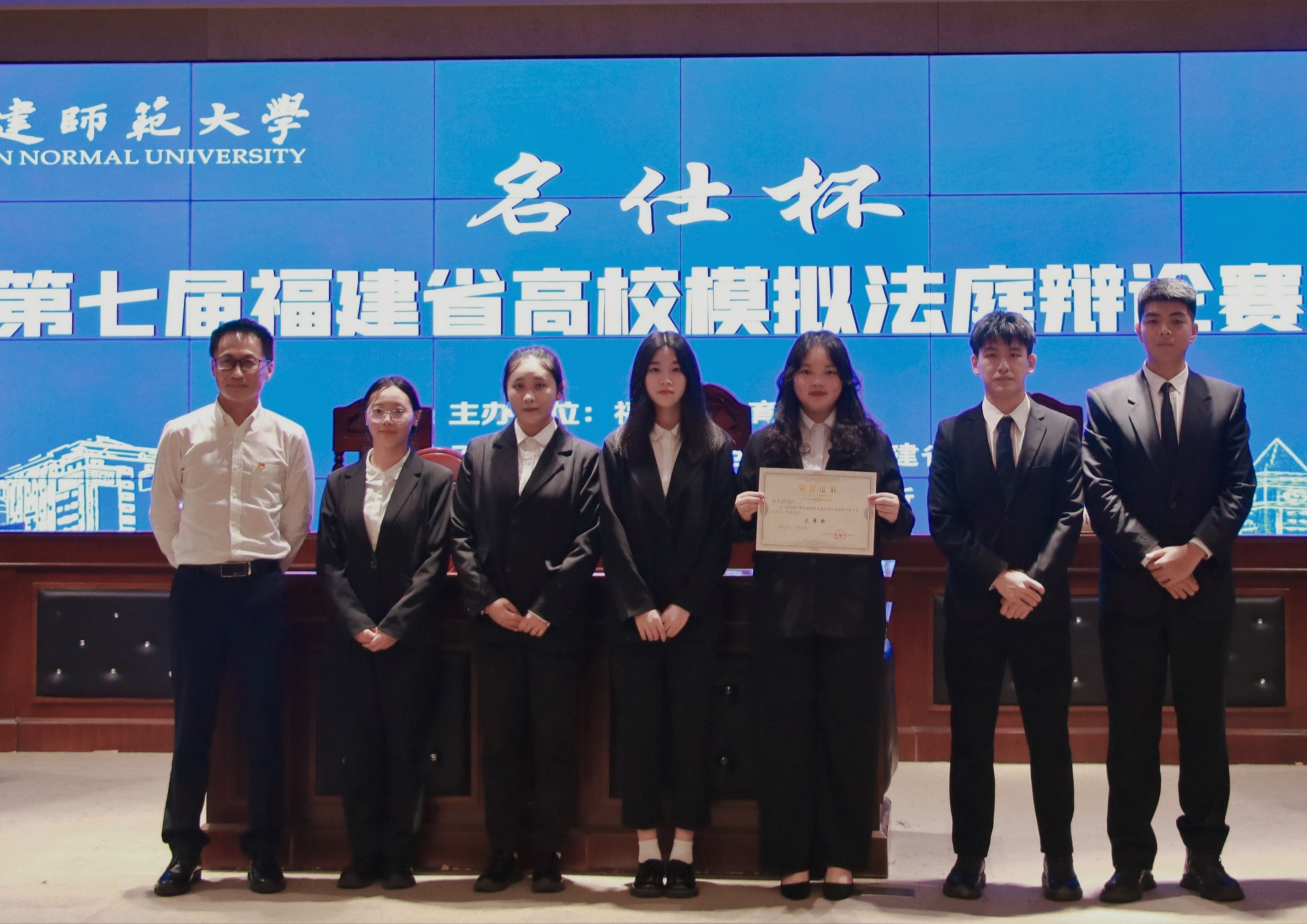 5月29日至30日,由福建省教育厅主办,福建师范大学、福建省法学会承办,名仕律师事务所协办的“名仕杯”第七届福建省高校模拟法庭辩论赛在福建师范大学旗山校区举行。我院代表队(周日萍、黄爱梅、李玲、林文宇、林羽、石家祺)凭借良好的心理素质和扎实的学科专业功底在此次比赛中脱颖而出,以优异的成绩荣获团体三等奖。
