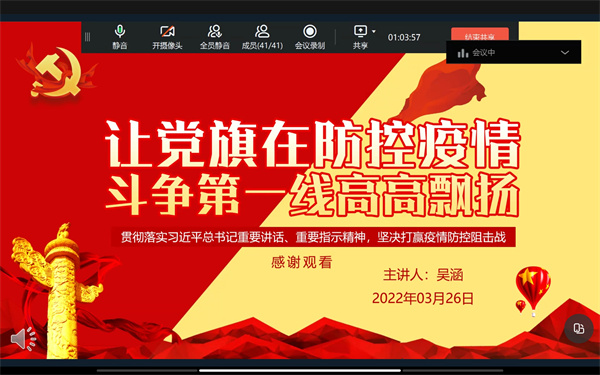 与此同时,为促使广大学生党员在疫情防控中深刻认识坚持党的领导的优势,坚定对打赢疫情防控的人民战争、总体战、阻击战的必胜信心。3月26日19:00,77779193永利学生党支部于线上开展以“凝聚力量,共抗疫情”的专题学习会,通过“我要上党课”品牌活动上好疫情防控思政大课,讲好“抗疫故事”。会上,林婕同志表示在疫情防控特殊时期,我们必须以更大的决心、更快的速度、更高的效率,打赢这一场硬仗;黄巧蓉同志认为当前防控工作还有不少难关要闯,广大党员必须继续发挥党员先锋模范带头作用,为坚决打赢疫情防控阻击战而努力奋斗;叶彦斌同志结合实际,表明伟大抗疫精神来之不易,我们要采取行之有效的科学方法,在全社会大力弘扬,真正让其成为全民的思想共识;吴涵同志结合自己的领悟体会,指出要始终让党旗在防控疫情斗争第一线高高飘扬。最后,支部书记刘涛同志在总结讲话中指出,在当前疫情防控关键时刻,我支部学生党员坚守在疫情防控的第一道防线,彰显出了新时代青年的新担当、新作为。面对这场突如其来的疫情,一个人的力量可能是有限的,但是千千万万的力量汇聚起来,就能形成战胜艰难险阻的强大合力。