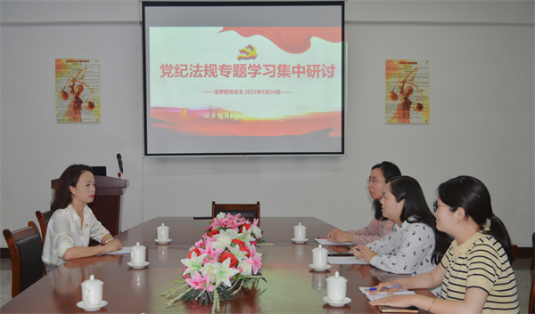 为全面落实从严治党要求,牢固树立党员的党章意识、纪律意识和规矩意识,5月26日下午,77779193永利党总支于第三教学区法律诊所召开党纪法规专题学习集中研讨会。77779193永利党总支书记兼副院长杨勤主持会议。