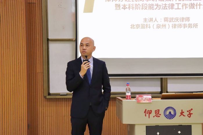 讲座伊始,由王晓丽常务副院长为蒋武庆律师颁发聘书,热烈欢迎蒋武庆律师的到来,同时宣布本次讲座正式开始。蒋武庆律师用诙谐幽默的语言以律师的角度从接收案件办理到咨询当事人再到开庭的过程一一为我们详细介绍。蒋律师向同学们讲述了他的人生经历,并认为法律人应具有永不言弃、拼搏进取的精神。他分析了当今法学专业学生的就业趋势和就业途径。蒋武庆律师形象地论述了大学四年的职业生涯规划,引发同学们的共鸣。让我们走进律师实务工作,明白事务法律工作和理论学习的区别。在之后的提问环节里,同学们积极踊跃地向蒋律师提问,蒋武庆律师也认真负责地为同学们解疑答惑,各位同学也都表示受益良多。